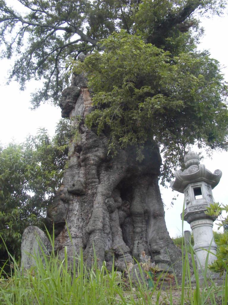 倉吉から鳥取に向けて各駅停車に乗ると、2つ目が「泊」の駅である。たった一人降り立った駅には期待していたタクシーもおらず、しばし途方に暮れた。駅前の電話からタクシーを呼ぼうとしたが、出ない。後で聞くと廃業したとのことであった。結局遠くの駅から来るタクシーを、ジュースの自動販売機がポツンと置いてある駅で、しばらく待つことになった。 タクシーの運転手も木の在処を知らず、ともかく筒地まで行って尋ねることにする。留守の家が多くて、教えてもらえずに探した末に、神社の隣の高台にポツンと立っている木を見つけた。墓所になっているらしく、周りには小さな墓石が並んでいる。 木の幹は確かに太く、7.2mの記録通りと思われたが、かなりの空洞が出来ていて痛々しかった。枝はおそらく台風で折れたものであろう、一枝だけが茂っており木全体は「くの字」型に曲がっている。手当をしないと早晩枯れそうに思われた。真新しい「村指定文化財」の標識が対照的であった。 |