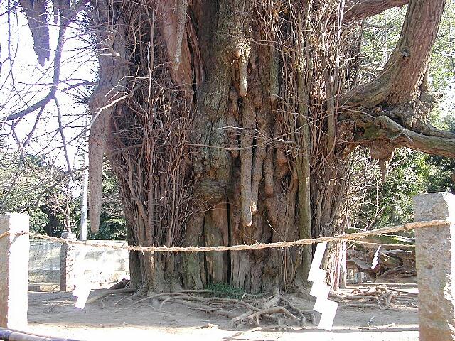 熊ちゃんからの3本目は、野木町の「野木神社のイチョウ」である。1991年の環境庁調査の記載によると、樹高13m、幹周9.67mであるが、5本の株立ちになっており、主幹の幹周は7.30mである。野木町の天然記念物に指定されている。熊ちゃんさんからは、次のようなメールが届いた。 「場所は、国道4号線を宇都宮方面に向かい、野木の信号の先を左折、野木小学校の近くにあります。高さは、たいしたことありませんが、推定樹齢の1200年は、この辺にもあまり無いと思います。高さ17m 太さ9m(栃木県神社庁のホームページより)です」 イチョウは巨木になると気根が垂れてくるので、これを乳房に見立てた伝承が多い。ここでも、米糠と白布で作った模型の乳房で祈願する民俗信仰があるそうだ。 徒歩で行くには、JR東北本線の古河(こが)駅で降りて、西200m程にある大通りを右折して北に向かう。2kmほど歩くと、国道4号線と合流する信号があるが、その手前の道を左に入り、野木小学校小の横を通って真っ直ぐ400mほど歩くと野木神社である。 JRの駅名の「古河」は日本最初の公害事件である足尾銅山鉱毒事件の原因企業であった「古河鉱業」に由来している。そして、この駅の北西には、鉱毒を沈殿させるために作られた「渡瀬遊水池」が拡がっている。 |