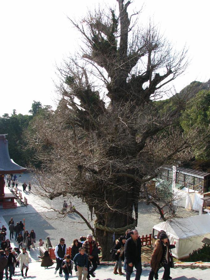 これまで3度も鎌倉の鶴岡八幡宮を訪れているのに、銀杏の紹介をしていなかった。今日(2010.3.10)の朝刊に鶴岡八幡の大イチョウが、昨夜来の春の嵐で倒れたという記事があり、慌てて、在りし日の姿をupすることにした。最後に行ったのは2年前である。倒れるとは予想できない元気な姿であった。学会が終わって飛び出したが、鎌倉に着いたのは夕刻で、日暮れと争いながらシャッターを押したのを思い出す。金色の紅葉を思い描いて行ったが、残念ながら少し早く、ほんのりとした紅葉しか見ることが出来なかった。 樹高20m、幹周6.8m、樹齢は1000年余と伝承されており、1955年に県の天然記念物に指定されている。神奈川県最大の銀杏は幹周9mの鶴嶺八幡のイチョウであり、鶴岡八幡宮の銀杏は幹周では劣るが、歴史的には有名で、神奈川県では最もよく知られた銀杏の木であった。1219年鎌倉幕府三代将軍、源実朝がこの銀杏の陰に隠れて潜んでいた公暁(くぎょう)に暗殺されたことから「隠れ銀杏」とも呼ばれてきた。倒木と共に、歴史の証人?が一人亡くなったことになる。人に比べて10倍以上の時代の移ろいを眺めてきた大イチョウにも寿命があるのだと思い知らされた。大往生と言って良いだろう。 JR横須賀線の鎌倉駅の北北東1kmの、鶴岡八幡宮の石段横にどっしりと立っていた。 ************************************************************** 「木々の移ろい」の相談役を永らく引き受けて下さっている梅本さんは、街路樹や公共樹の調査や対応策の計画もされる樹木の専門家である。鶴岡八幡宮のイチョウについても、以前から衰弱に気付いて注目しておられ、昨年末(73日前)にも写真を撮っておられた。今回の倒壊について梅本さんは次のように語っておられる。「以前から、前傾姿勢だった事は気にかかっていましたが、やはり、長年に及ぶ幹や根株の「腐朽」と、想像以上に加わる「風荷重」、雨による水分の重み、芽吹きの為の水の吸い上げ、等などによって、根元の弱い箇所に、一気に荷重が加わったのでしょうね。負担を軽くするために、軽減剪定を行って大枝も整えられていたのですが、本当に難しいものです。」 確かに昨年末の写真では、前傾姿勢が顕著である。漫然と巨木を見るのでなく、その樹勢の変化にも目を配っておられたことに感服した。 |