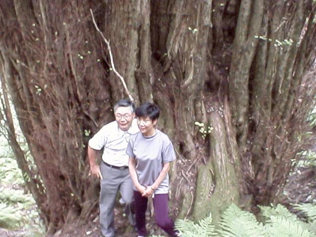 全国で7番目にランクされている。 今回は、友人夫妻(写真の二人)の車に乗せてもらって、大カツラを目指した。 大阪府池田市から173号線(能勢街道)を北上する。能勢町から兵庫県に入り、 さらに京都府との県境近くで、三叉路を西紀町方向への細い道に入る。 藤坂村の春日神社を過ぎてしばらく走ると、左手に「藤坂の大カツラ」の道標がある。 ここで車を捨てて、道なりにどんどん山に入っていく。5分ほど登ると 右手に道標があり狭い山道にと導かれる。道は急坂で、所々丸太の階段が作ってある。 昼なお暗い森の中を5分ほど登ると、前方に巨大なカツラが姿を現す。 (途中でマムシを見かけたので要注意!)。 さすがに、兵庫一の巨木である。近寄ると、人が小さく見える。樹高20-38m、 目通り幹周13m、15本以上の太い枝からなっている。毎年5月10日に 藤坂の春日神社で行われるお祭りには、この木の枝を切って祭礼に用いる と言うことである。古くから村の人たちに大切にされてきたことがわかる。 |
