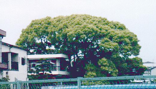 門真市で、三島神社の薫蓋樟(くんがいしょう)に次いで大きいものは 「稗島のくす」(ヒエは草冠が要る)である。地下鉄の鶴見緑地公園駅で降りて、 北西に歩いて近畿自動車道を越え、古川に沿って数分歩くと、民家を覆うように 大きな樟が遠望される。
