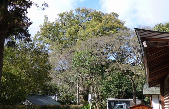 しまなみ海道の中央に位置する大三島の「大山祗(おおやまずみ)神社」には、楠の巨木群があって、一括して国の天然記念物に指定されている。その内の3本は特に有名で、最も大きいものは、「乎千命御手植の楠」で、樹高15.6m、目通り幹周り11.0m、樹齢3000年と伝えられる。このほかに、幹周り11mの「生樹の御門」、同10mの「能因法師雨乞いの楠」がある。後者は枯れて株だけになっている。 あささんに送っていただいた大山祗神社の楠巨木群の内、上記の3本以外をまとめてご紹介しよう。いずれも、あささんの解説付きである。 ******************************************************************* @ 境内右側に生えている大クス 幹径2.6m(断面が真円ならば幹周8.2m)。何十年も前からずっと枯れ木だと思っていましたが、最近になって高さ3m地点から1枝芽吹いているのを確認しました。この状態で枯れてないのは逆にすごい。高さは24mと表記がありますが、腐朽が進んでいるので半分以下でしょう。 A 境内左側に生えている大クス 幹周推定9〜10m程度。樹高15mの「乎千命御手植の楠」よりも2回り高いので20m前後でしょうか。他の神社なら立派に御神木としてやっていけそうな大きさですが、しめ縄も巻かれておらず全くの無名の木です。観光客や地元の人も気にしている様子はなさそう。木にとっては放っておかれた方がいいのでしょうね。若々しく樹勢旺盛です。左側の林にも大きな木がたくさんあり、幹周5m級が8本位ありました。 B 倒れているのは、「河野通有兜掛の楠」です。 このクスノキは、かつて相当な巨木だったそうですが、元亨2年(1322年)の戦乱で、本殿・拝殿・神宮寺等と一緒に焼失してしまったそうです。余りの大きさに三日三晩燃え続けたと伝承があります。今は大山祇神社の神門の脇に横たえていて、かつての巨体をしのばせます。 Wikipediaによると国指定天然記念物とありますが、倒木のため元々指定はないようです。名前の由来は、弘安4年(1281年)に河野通有が大山祇神社参拝し、蒙古襲来にあたって、戦勝祈願をした際にこのクスに兜を掛けたためといわれています。 C 第三号樹 大山祇神社の裏の雑木林の中に生えているクスノキで、愛媛県による解説では「高さ48メートル、根回り70メートル、目通り8メートルで円形にひろがる。根株がことに美しく樹勢きわめて旺勢である。」(1951年調査)とあります。 ただ、太い幹を2本失っており、かつてほどの樹勢はなさそうです。 根回り70mが本当ならば異常な大きさですが、枝張りの間違いでしょうか。 立ち入り禁止で近くに接近できず、落ち葉が50cm以上積もっていて根元は確認できませんでした。 国指定天然記念物です。「第三号樹」というのは管理番号のようなものでしょう。 「乎千命御手植の楠」が「第一号樹」に相当するようです。 ****************************************************************** 大山祗神社への行き方は「生樹の御門」のページに詳述してある。 |
