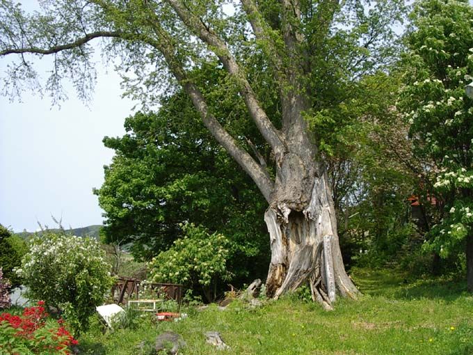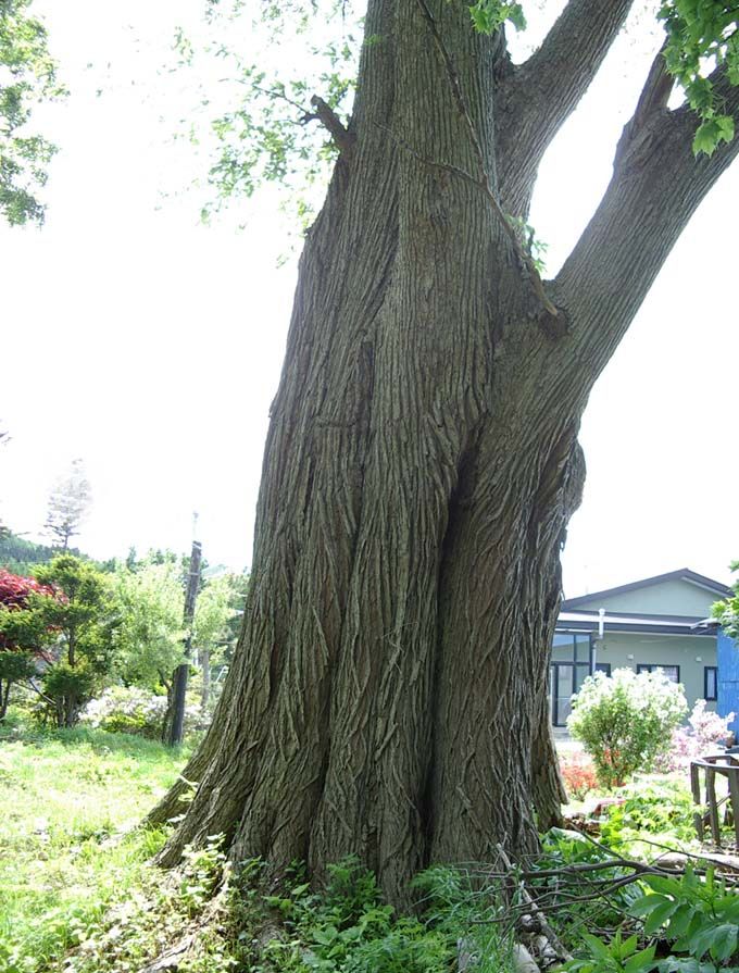 こちらも昨秋からのお楽しみであった、北海道第一位のハルニレの写真である。西村さんの説明文が冴える。 ************************************************************ 2003/12/17 江差からの帰りに訪問。上ノ国町からJR線に沿って木古内町へ向かう道道を行く。3Km位で中須田という地区の踏切を渡る手前右に葬儀社と稲荷神社がある。その間を入り、道なりに行くと天の川の橋を渡る。T字路を右に曲がると30m程で右に鳥居があり、北海道第1位のハルニレが見える。 文献によれば幹周620cmである。が、無惨でもある。高さ2m位から下はぼろぼろで、木全体も左(西)へ傾いていて、見るからに衰弱した様子である。葉は既に散っているので樹勢ははっきりしないが、枝は数本すっくと伸びているので、案外元気なのかもしれない。若葉の頃にもう一度来てみたい。なにしろ北海道第1位のハルニレなのだから。この小森神社は奥の小高い所に社の代わりの小屋があるだけの無人の神社である。多分近所の人が宮司をしているのだろう。鳥居には細いシメナワが掛けられている。ハルニレには説明の柱が立てかけられているが、かなりの部分が剥げていて何が書かれているのかにわかには判読できない。推察も合わせると、 「上の国開基800年 戸長役場設置110年記念 名木指定 樹種ハルニレ 上の国町」 と思われる。 2004/05/19 春に再訪することが出来た。境内には桜も咲いて若葉が伸び、何事もないのんびりした雰囲気です。ハルニレは相変わらず傾いたままですが、若葉の付いた枝枝を伸びやかに広げています。樹齢は不明ですが、幹周から言って500年を越えていると思われます。幹の裏側だけ見ると全く健康な幹です(写真3)。こんな幅の広いニレの幹は始めて見ました、さすがです。傾いているとは言え、枝は上へ上へと向かっていて、いかにもニレらしい樹形です。強風が心配ですが、一年でも長く生き続けて欲しいものです。 *************************************************************** JR江差線で、函館方面から行くと、上ノ国駅の一つ手前の中須田駅で降りる。南西に200m歩くと広い道道に出るので、これを左に曲がって500mほど歩くと、踏切の手前に右手に入る道が見える。あとは、本文の通りに歩くと小森のハルニレに着く。駅からは1.5km程の距離がある。 |