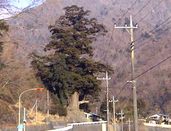 実に重量感のある杉である。 徒歩で行くには、小田急線新松田駅より西丹沢自然教室行きのバスに乗り、 箒沢で下車する。少し道を引き返せば「ほうき杉」である。丹沢湖、中川温泉を越えて さらに奥になる。 「ほうき杉」の名前の由来は、この地の名前の「宝木沢」からとったとも、 杉の形が箒に似ているところからきたとも言われる。昭和47年にこの地を襲った 丹沢集中豪雨の際には、この木一本で土砂崩れをくい止め、 箒沢の集落を崩壊から救った。 以下は、篠沢さんのお便りです。 「今日は元旦で、すでに成人した子供達も出かけているため、夫婦で、 神奈川県で一番大きな杉を見に行きました。神奈川県の山北町にある箒杉です。 三保ダム、丹沢湖の奥にあります。初めてデジタルカメラで撮りました。 この杉は11年前に見て以来4回目の訪問です。 県道わきの傾斜地にそびえる巨樹で樹高45メートル周囲12メートルと県下で最も幹が 太い杉です。樹齢2000年と言われています。樹形が箒に似ていることから箒杉の名前 で親しまれております。また、昭和47年の丹沢集中豪雨のとき、土砂崩れをくいと め、箒沢の集落をすくったため地元の人からも信仰されています。今日も地元のおば あさんがお参りにきておりました。」 |