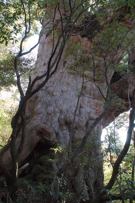 縄文杉に至るには、安房川に沿ってトロッコ道を遡上するコースと、宮之浦川から遡上するコースがあるが、前者が一般的で、後者は熟練者でないと危険である。その浦之宮コースの途中に「太古杉」と「龍神杉」があり、縄文杉よりも自然な姿を止めていると言われる。もっとも、縄文杉から更に宮之浦川コースに入って太古杉に至る事も可能であるが、また引き返さねばならず、健脚の人でないと、なかなか行けない。 その太古杉の迫力ある写真を2005年に登られたRedbearさんから送っていただいた。樹高・幹周の記録は環境庁調査にはないが、RedbearさんのHP「巨きな樹に会いたい」によれば、樹高17.6m、幹周8.5mとなっている。かなりの大きさである。しかも、間近まで近づくことができる。霧の中に浮かび上がっている写真は、感動的ですらある。巨樹を前にしたRedbearさんの息づかいが伝わってくるようだ。 屋久島には、鹿児島からの空路(40分)、または高速船(2時間30分)フェリー(4時間)で入る。南東海岸の安房からバスで荒川登山口に行き、トロッコ道を登り始めるのが一般的である。途中、翁杉・ウイルソン株・大王杉を経て、縄文杉に至る。往復で約10時間、高低差700mの道のりである。宮之浦川を遡る道は、道しるべが不確かな上に整備されていないため、十分な装備をして、案内人と共に登る必要がある。 |