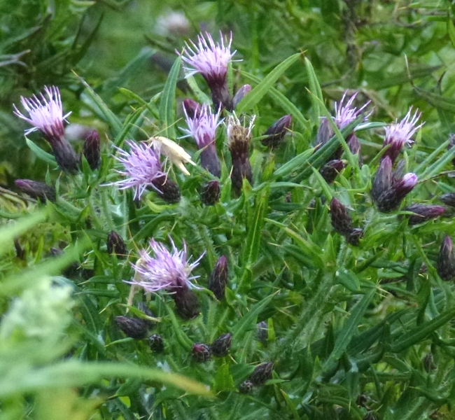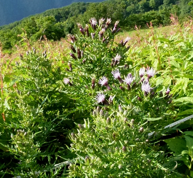 コイブキアザミ−小伊吹薊| 伊吹山の固有種で、頂上付近の草原に群生する。高さは50−100cm。全体がアザミの花束のようで、込み合って丸くなっている。上向きに沢山の頭花を開く。茎には毛があり上部は枝分かれしてビッシリと葉が付く。葉は細長く先端には鋭い棘がある。 花はピンク色で吹き出すように咲く。総苞は筒状で、総苞片は6列に並ぶ。8月には蕾が多いが、開いているものもある。 学名は Cirsium confertissimumで、キク科アザミ属の多年草である。花期は9-10月。伊吹山の固有種で、石灰岩地に生える。confertusはラテン語で、込み合った、押し合うの意味。鈴鹿山系のスズカアザミと似る。 |
