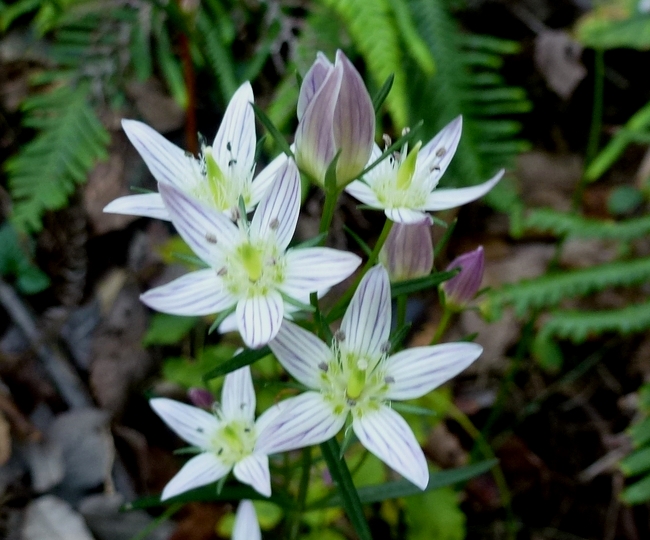センブリ−千振| ジュウヤク、センブリ、ゲンノショウコは三大民間薬と呼ばれ、古くから人々に親しまれている。私の祖母は、ジュウヤクの信奉者だったので、子どもの頃の私は毎日のようにジュウヤク茶を飲まされていた。センブリもよく名前は聞いていたが、その花を初めて見た。薬の苦さからは想像もできない綺麗な5弁の花である。白い花弁に紫の筋が美しく、先端が尖っていてキリッとした感じを与える。 センブリは、乾燥した葉・茎を煎じて飲むと腹痛を始め胃腸の病に効くと言われる。「良薬口に苦し」と言われるが、センブリの苦さは相当のもので、湯で千度振り出しても苦さが取れないと言うことから「千振」と呼ばれる。日本固有の民間薬であり、漢方薬ではないが、日本薬局方の苦味チンキに用いられ、医薬品である。実際の薬効成分はよく解らないが、苦味配糖体であるスウェルチアマリンに薬効があるとも言われている。 センブリは日当たりの良い山野に生える。20cmほどの高さになり、円錐状に多数の花を付ける。花期は8-11月と長い。 学名は Swertia japonicaで、リンドウ科センブリ属の2年草である。日本全土の山野に生える。japonicaはラテン語で、日本の女性形。センブリが日本の固有種であることが分かる。花の色が紫がかったものをムラサキセンブリと言い、関東地方以西に分布する。 |