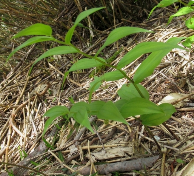 タケシマラン−竹縞蘭| 立山荘で自然観察のスライド会があり、自然観察員の方が弥陀ヶ原で咲いている花を紹介された。その日の私の収穫は少なかったので、「そんなに咲いていますか」と反問したら、「よく探したら見つかりますよ」と言われたので、翌日はかなりじっくりと探した。お陰で50種近くの高山植物の花を写すことが出来たが、その一つがタケシマランの花であった。花は大きな葉の陰に隠れて下向きに咲くので、見つけるのも写すのも大変である。木道に寝ころんでやっと写したが、ピントがいまいちである。6枚の緑色の花弁が反り返って、6個の雄しべ?と中央に子房が見える。花期は6月で、緑色の実を付け、8月には赤く色付く。 葉は4−10cmの卵状披針形で、茎を抱かない。葉の大きなオオバタケシマラン、葉の細いヒメタケシマランなどの品種がある。 学名は Streptopus streptopoides var. japonicusで、ユリ科タケシマラン属の多年草である。中部地方以北の深山の針葉樹林帯に生える。学名をvar.の代わりにsubsp.としているものもある。 |