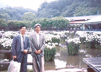 幸いなことに、この季節は、天満宮の泉水では、花菖蒲が満開で、これを 見ながら茶店で食事をとる人も多い。泉水には「紫は水に映らず花菖蒲」の 句碑が建っており、関谷さんは科学的立場から、この句がいたく気に入って いるようであった。 |