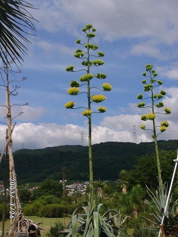 日本では、約50年に一度しか開花が見られない珍しい花である。しかも、5mにも及ぶ巨大な茎を伸ばして花を咲かせたあと、親株は枯死してしまう。壮絶な一生である。 高槻にお住まいの門野さんから、「市大植物園で、珍しいアオノリュウゼツランの花が咲いていますよ」とメールを頂いた。忙しいのでかなり躊躇していたが、もう50年後というと、どう考えても無理。この機会しかないと、思い切って出かけた。昨年開花したという一株は既に枯死状態であったが、横にある3株が見事な花を咲かせていた。5m以上に達する花茎が3本立ち上がり、大きな黄色の花を付けている様は壮観である。 もともと、メキシコの乾燥地帯に原産の植物で、メキシコではもっと短期間で世代交代するが、日本では数十年を要する。市大植物園の木は昭和30年頃に植えられたものであるという。今年は5月頃から花芽が出始め、成長の早い時期は花茎が一日10cmも伸び上がったそうである。6月中旬には花芽が分岐し、7月には5mに達してつぼみが膨らみ始め、中旬には開花を迎えた。あと1週間ほどは花が見られる。成長過程の写真は大阪市立大学理学部附属植物園のホームページに詳しい。 ******************************************************** 神戸大学でMBAを取得した安井さんから、神戸大学(六甲台本館玄関東側)でリュウゼツランの花が開いたというニュースを知らせていただいた。以下のアドレスから写真を見ることが出来る。(2010.8.22) http://www.ryosokai.net/business/ryuu11.JPG http://www.ryosokai.net/business/ryuu12.JPG |