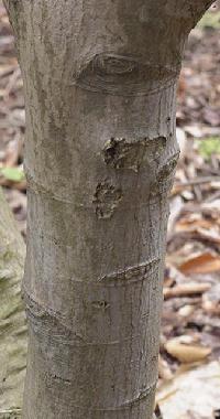 京都府立植物園のアジサイ園にあるフウは何時も赤く紅葉する(幹の下は地上に落ちたフウの実)