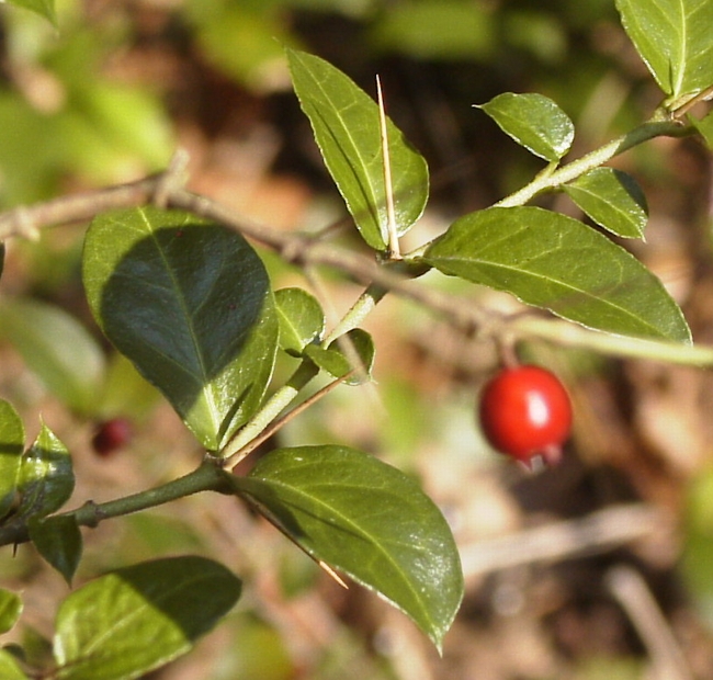 何ともすごい針である。アリドオシとは良く言ったものだ。京都府立植物園の生態園で滅多に覗かない木の陰に白い花が咲いているのを見付けた。花がなければ気付かなかったであろう。 常緑の小低木で、5月にラッパ状の2cmほどの小さな白い花を付ける。雌蘂が鐘を打つ紐のように長く突き出し、奥には4本の雄蘂が隠れている。直径5mm程度の果実は冬に赤く色付く。葉は対生しており、その中央から2cmぐらいの細く長い棘が、近づくものを狙う。 学名はDamnacanthus indicusで、アカネ科アリドオシ属である。関東以西の日本と東南アジア、インドに広く分布する。 |