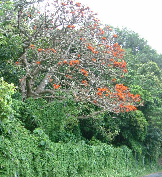 沖縄の県花である。3−5月に燃え立つような赤い花をびっしりと付ける落葉喬木で、高さは15mに達する。沖縄が自生の北限であるが、いかにも南の花という感じである。沖縄の各地で街路樹・公園樹として植えられている。 花はマメ科特有の蝶型で6cm程度であるが、総状花序をなしており30cm以上の房になっている。花の後は、20cm近い豆果を下垂させる。幹には鋭い棘があるが、琉球漆器の材料に用いられる。 学名はErythrina variegata var. orientalisで、マメ科デイゴ属である。インド−東南アジアが原産。沖縄本島ではディーグといい、石垣島ではズグと呼ばれる。 |