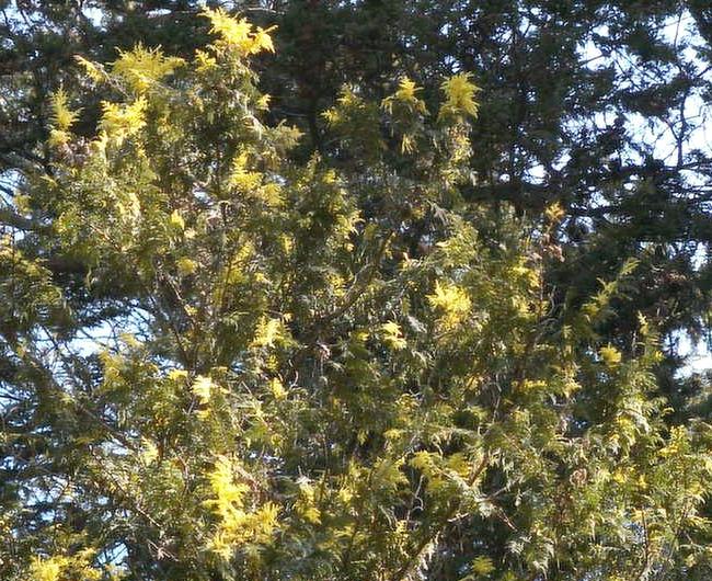 これもサワラの園芸品種であるが、近年公園や生け垣としてよく見かける。特に新芽が黄金色でとてもよく目立つ。日が当たっているようで美しい。サワラと異なり、多くは5m以下の低木である。刈り込みにも良く耐えるので、庭木としても重宝される。葉の裏には、蝶々のような形の気孔帯が白く見えている。