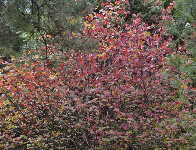 別名をベニマンサクという。マンサクでは枯れ葉が目立つのに対して、マルバノキは紅葉が美しい。大きな葉が黄色から紅色まで色々な色彩に紅葉する。花は、マンサク科特有の、エイリアンのような形をしている。マンサクに比べると小さめ(10mm程度)だが、よく見ると良い色である。 低木だが、株が広がるとかさが大きくなり、紅葉が派手立つ。花は紅葉が終わった後に咲き、翌年の秋に実がはじけて4個ずつの種子が飛びだす。 学名はDisanthus cercidifoliusで、マンサク科マルバノキ属である。 ***************************************************** 大阪の橋口さんは、11月の好天の中を馬籠から野尻まで中山道を歩いて、馬籠峠付近でマルバノキの見事な紅葉を見つけられた。送っていただいた写真を最下段に掲載しています。(2007.11.6) |