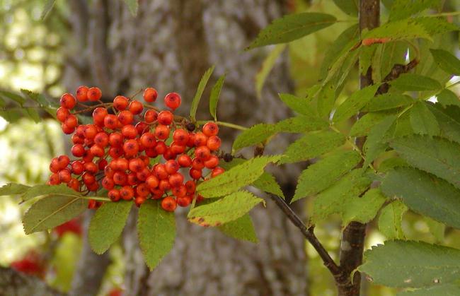 5月に白い花をつけたナナカマドは、7月には緑の実、8月には黄色の実を付けているのが見られる。やがて、9月末には真っ赤に色づいて、紅葉より一足先に山に彩りを添えてくれる。ナナカマドは秋山で見る代表的な赤い実であり、奇数羽状複葉の葉と共に、一度見ると忘れることはない。そして10月、次第に葉が紅葉を始め、秋を彩る。10月も終わりになると、葉が散った後も木々には赤い実が残り、晩秋の面影を演出する ナナカマドは憶えやすいが、ウラジロナナカマドとの区別がやや難しい。ナナカマドの実は球形であるが、ウラジロナナカマドの実はやや楕円形である。葉の先端の形(ナナカマドの葉の方が尖っている)と実を見ると同定することが出来る。 学名はSorbus commixtaで、バラ科ナナカマド属である。 |
