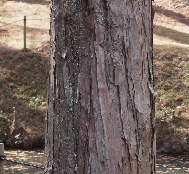 水辺によく生えるので水松と呼ばれる。松のように細い葉を持っているが、スギ科である。しかも、秋には紅葉し、落葉する。中国南部の原産で、明治時代に日本に渡来した。3−4月に目立たぬ花を葉先に咲かせ、9−10月には茶色の球果となる。